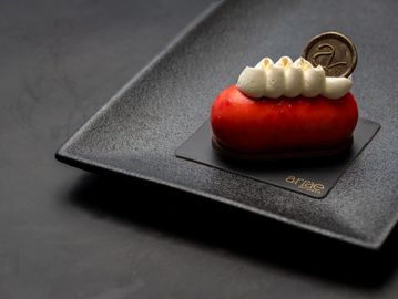Chocolate sable, Devils Food cake, dark chocolate ganache, kirsch cherry compote, Tonka mousse, cherry glaze, vanilla whipped ganache.
