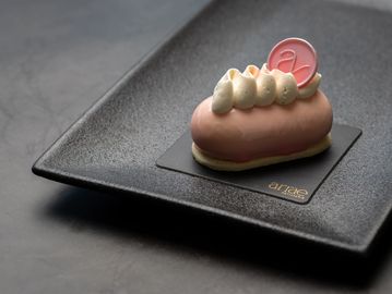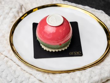 Sweet dough, vanilla sponge, raspberry compote, pistachio mousse, white chocolate glaze, white chocolate almond dip.