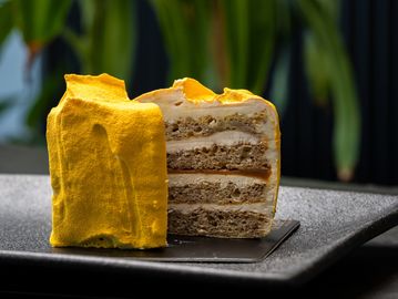 Carrot cake, cream cheese frosting, gold glitter glaze, white chocolate, gold lustre.