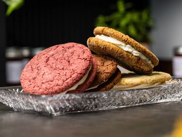 Red Velvet - Cream cheese buttercream between two red velvet cookies.