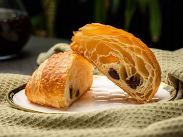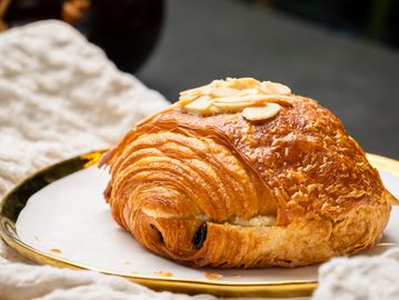 Croissant dough, rum syrup, almond cream, sliced almonds, chocolate sticks.