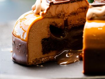 Dark chocolate recomposed streusel, Devils Food Cake, salted caramel, caramel chocolate mousse, caramel glaze, whipped ganache, dark chocolate dip.