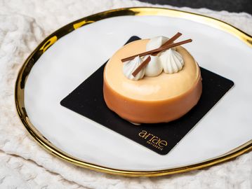 White chocolate crunch, vanilla cake, cinnamon peach compote, vanilla mousse, white chocolate glaze, milk chocolate dip, cinnamon whipped ganache.